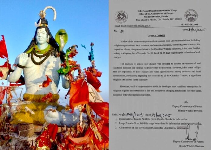 लिहाजा, बढ़ते रोष के बीच हिमाचल प्रदेश वन विभाग की ओर से 27 मई को जारी आदेश में चूड़धार वन्यजीव अभ्यारण्य में आने वाले श्रद्धालुओं एवं पर्यटकों से उपयोगकर्ता शुल्क लेने पर रोक लगा दी गई है। माना जा रहा है कि विभाग ने ये निर्णय विभिन्न हित धारकों, धार्मिक संगठनों और स्थानीय लोगों की मांग पर लिया है।