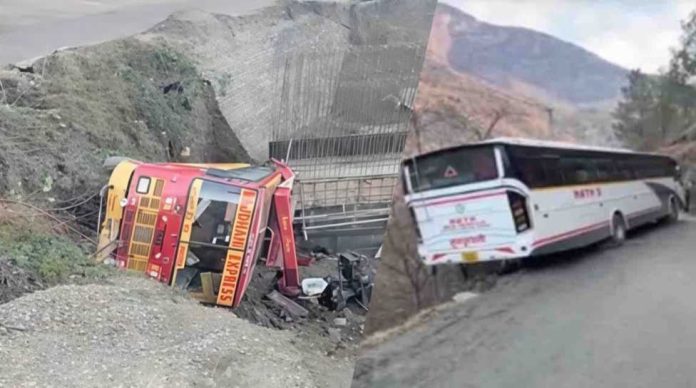 हिमाचल में फिर बस हादसे : बिलासपुर में निजी बस खाई में गिरी, कुल्लू में हवा में लटकी पर्यटकों से भरी बस