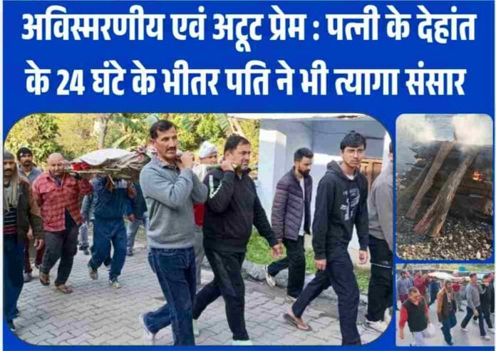 श्री रेणुकाजी : हिमाचल प्रदेश में एक मार्मिक घटना सामने आई है, जहां पत्नी के देहांत के 24 घंटे के भीतर पति ने भी संसार को अलविदा कह दिया. अविस्मरणीय एवं अटूट प्रेम की यह घटना जिला सिरमौर के श्री रेणुकाजी क्षेत्र की है, जहां साथ सटे बैडोन गांव के एक दंपति के बीच प्यार इतना गहरा था कि दोनों ने एक-दूसरे के बिना जीना स्वीकार नहीं किया.