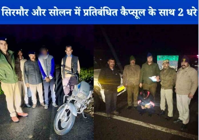 सिरमौर/सोलन : हिमाचल में नशे के खिलाफ पुलिस का अभियान लगातार जारी है. ताजातरीन मामलों में जिला सिरमौर और सोलन में पुलिस टीमों ने दो युवकों को प्रतिबंधित कैप्सूल की खेप के साथ धर दबोचने में कामयाबी हासिल की है.
