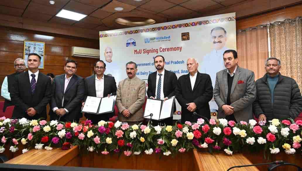 शिमला : हिमाचल प्रदेश सरकार और राष्ट्रीय डेयरी विकास बोर्ड (एनडीडीबी) के मध्य सोमवार को मुख्यमंत्री सुखविंद्र सिंह सुक्खू की उपस्थिति में तीन समझौता ज्ञापनों पर हस्ताक्षर किए गए। इन समझौता ज्ञापनों पर प्रदेश सरकार की तरफ से सचिव पशुपालन रितेश चौहान और प्रबंध निदेशक द हिमाचल प्रदेश राज्य सहकारी दुग्ध उत्पादक प्रसंघ समिति अभिषेक वर्मा ने हस्ताक्षर किए, जबकि राष्ट्रीय डेयरी विकास बोर्ड के अध्यक्ष डॉ. मीनेश शाह ने बोर्ड की ओर से हस्ताक्षर किए।