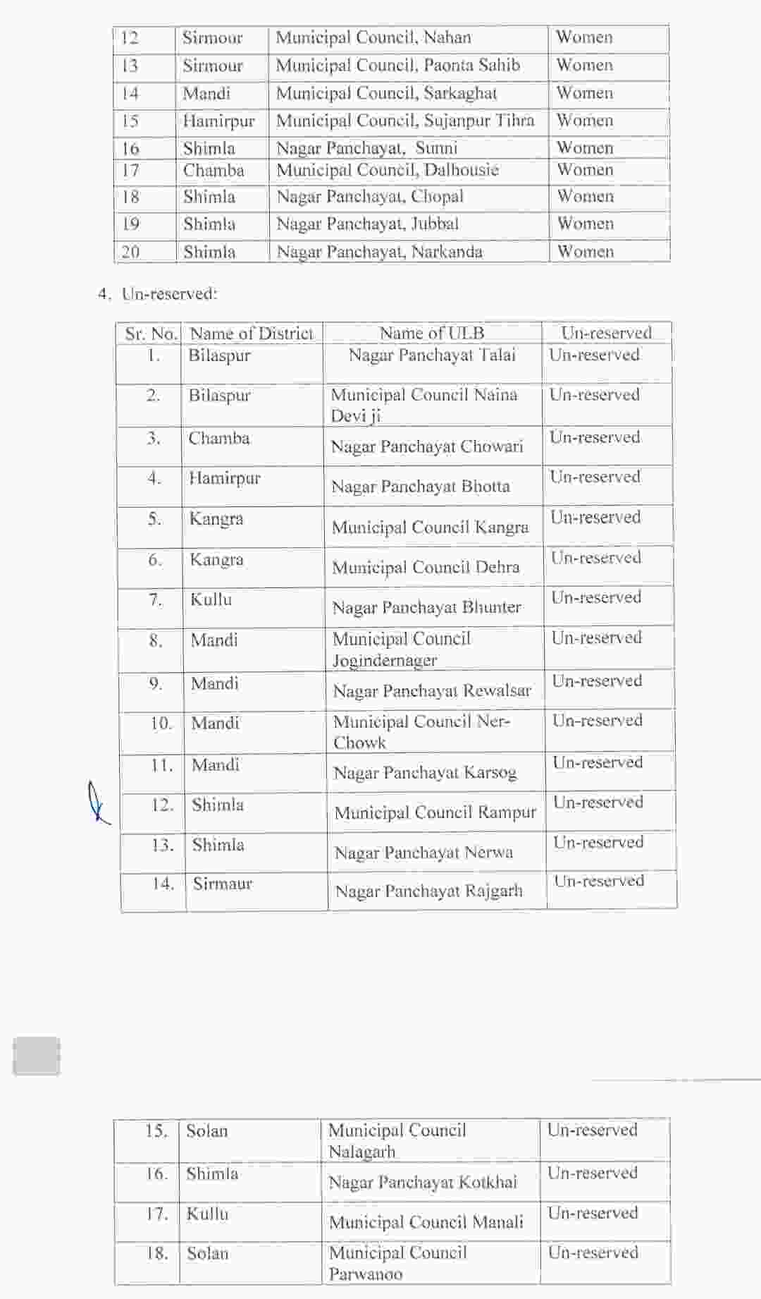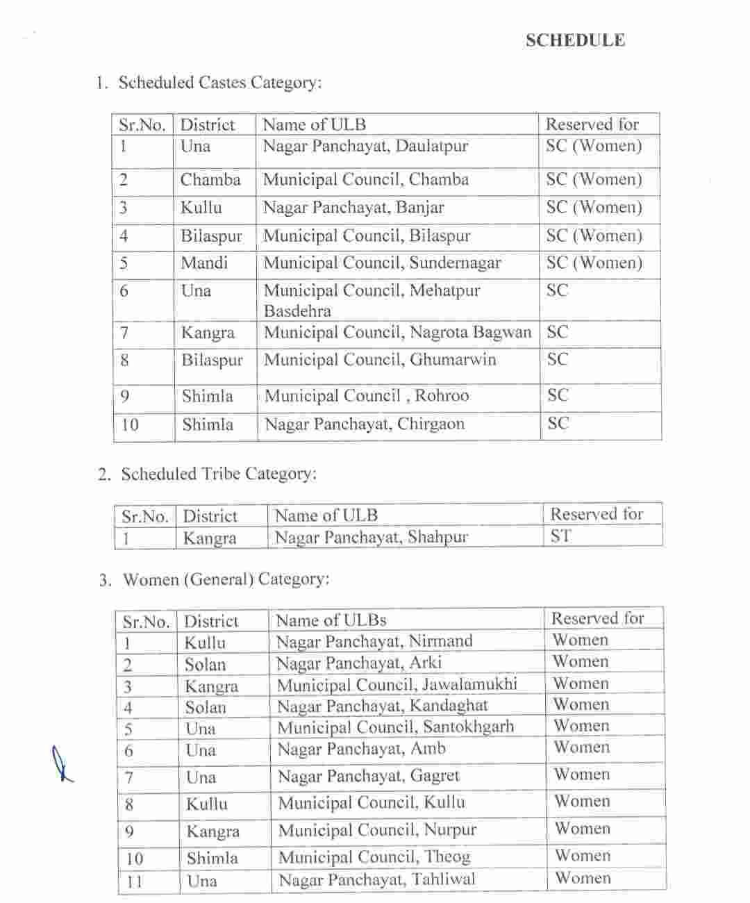 जारी सूची के अनुसार प्रदेश की विभिन्न नगर परिषदों और नगर पंचायतों में अनुसूचित जाति, अनुसूचित जनजाति और महिलाओं के लिए पद आरक्षित किए गए हैं, जबकि कई स्थानों को अनारक्षित श्रेणी में रखा गया है। अनुसूचित जनजाति श्रेणी में कांगड़ा जिले की नगर पंचायत शाहपुर को रखा है।