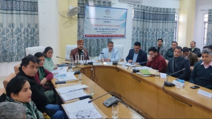 नाहन: सांसद सुरेश कश्यप ने डीसी कार्यालय के बचत भवन में जिला विकास समन्वय एवं निगरानी समिति (दिशा) की बैठक की अध्यक्षता करते हुए उपस्थित अधिकारियों को निर्देश दिए कि वह रुके कार्यों को समयबद्ध और गुणवत्तापूर्वक पूर्ण करें. इस बैठक का उद्देश्य यही है कि केंद्र सरकार की ओर से जिला सिरमौर में चलाई जा रही योजनाओं की कार्य समीक्षा करना और उन योजनाओं को समयबद्ध व चरणबद्ध तरीके से पूर्ण करने के साथ-साथ आरंभ की गई नई योजनाओं का लाभ भी जिलावासियों को मिल सके. उन्होंने अधिकारियों को यह भी निर्देश दिए कि वह सरकार की ओर से चलाई जा रही योजनाओं की जानकारी आमजन तक पहुंचाना सुनिश्चित करें.