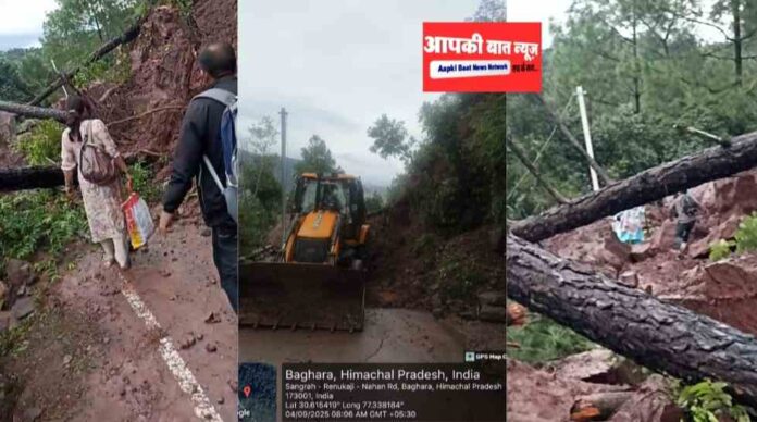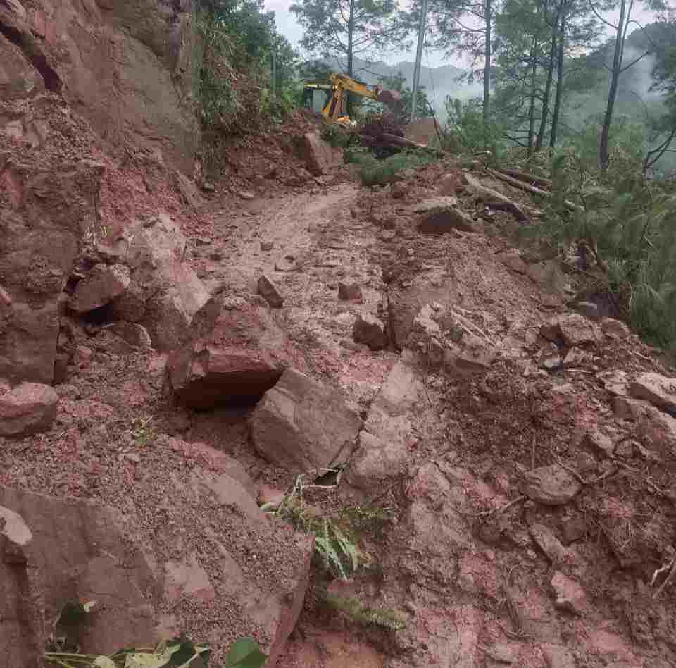 नाहन : नाहन-श्री रेणुकाजी सड़क पर नेहली से कुछ ही दूरी पर आज सुबह भारी भूस्खलन हुआ, जिससे 50 मीटर से ज्यादा हिस्सा पूरी तरह अवरूद्ध हो गया है। यहां पहाड़ी से चीड़ के पेड़ भी भूस्खलन की चपेट में आकर सड़क पर गिरे हैं।