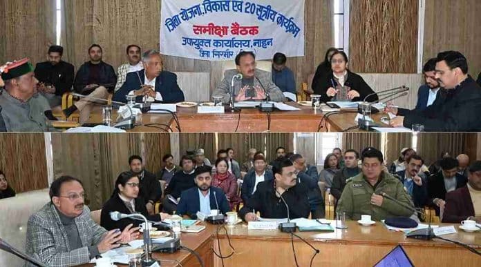 नाहन : उद्योग, श्रम एवं रोजगार मंत्री हर्षवर्धन चौहान ने गुरूवार को जिला सिरमौर के नाहन में जिला योजना, विकास एवं 20 सूत्रीय कार्यक्रम की समीक्षा बैठक की अध्यक्षता की। विधायक पांवटा साहिब सुखराम चौधरी, डीसी सिरमौर प्रियंका वर्मा, एसपी निश्चिंत सिंह नेगी समेत सरकारी एवं गैर सरकारी सदस्य बैठक में उपस्थित रहे। बैठक की अध्यक्षता करते हुए उद्योग मंत्री ने अधिकारियों को गैर सरकारी सदस्यों के मुद्दों को गंभीरता से लेने को कहा, ताकि सबके साथ मिलकर जिला को विकास की राह में अग्रसर किया जा सके। उन्होंने गैर सरकारी सदस्यों को लोगों की समस्याओं के समाधान के लिए अपने क्षेत्र की समस्याओं को रखने का आग्रह किया।