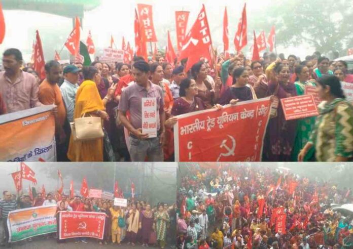 नाहन : संयुक्त ट्रेड यूनियन के आह्वान पर बुधवार को जिला भर से सैकड़ों की संख्या में मजदूर सड़कों पर उतरे और बस स्टैंड से लेकर डीसी कार्यालय तक एक विशाल रैली निकाली।