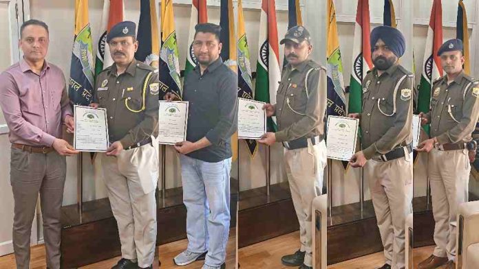 इसी तरह गोल मार्केट क्षेत्र में युवक को डरा-धमकाकर उसके मोबाइल से जबरन ऑनलाइन ट्रांजेक्शन करवाकर धनराशि हड़पने वाले गिरोह का मात्र 48 घंटे में पर्दाफाश कर पांच आरोपियों की गिरफ्तारी सुनिश्चित करने पर एएसआई राजीव कुमार, कांस्टेबल अमरीक सिंह, कांस्टेबल/चालक मोहम्मद आशिक और होमगार्ड राकेश कुमार को सम्मानित किया गया। एसपी विनोद धीमान ने कहा कि पुलिस कर्मियों की तत्परता और पेशेवर कार्यशैली से क्षेत्र में कानून-व्यवस्था मजबूत हुई है। उन्होंने भविष्य में भी पुलिस अधिकारियों और कर्मियों से इसी प्रकार उत्कृष्ट कार्य की अपेक्षा की जताई।