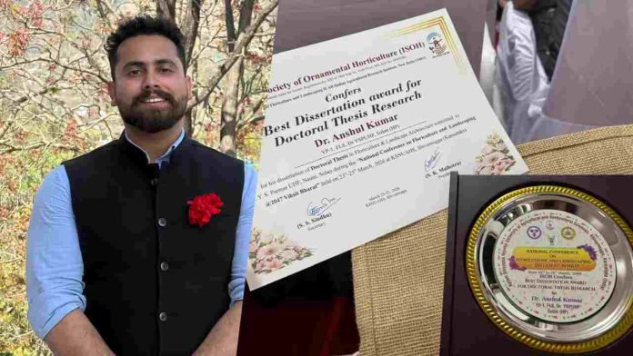 सोलन : पुष्पकला और लैंडस्केपिंग विभाग के वैज्ञानिक डॉ. अंशुल कुमार को उनके उत्कृष्ट शोध कार्य के लिए बेस्ट डॉक्टोरल डिसर्टेशन अवॉर्ड से सम्मानित किया गया है। यह सम्मान उन्हें वर्ष 2025 में पूर्ण किए गए अपने पीएच.डी. शोध “स्टडीज ऑन स्टोरेबिलिटी, फिजिको-केमिकल एंड सेंसरी कैरेक्टरिस्टिक्स ऑफ गुलाल डिराइव्ड फ्रॉम फ्रेश एंड ड्राइड मैरीगोल्ड फ्लावर्स” के लिए प्रदान किया गया।