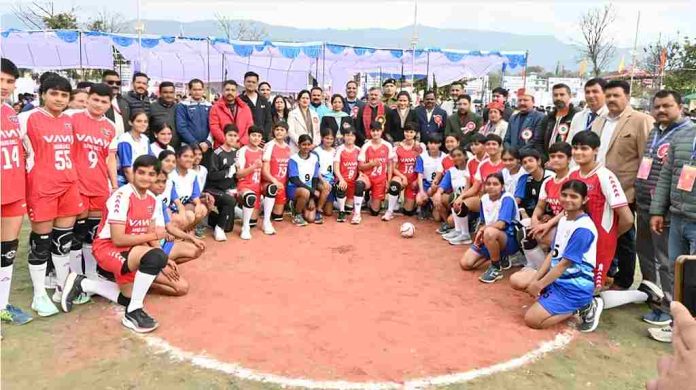 घुमारवीं : 69वीं राष्ट्रीय स्कूल गेम्स की अंडर-19 (छात्रा) हैंडबॉल प्रतियोगिता का आज घुमारवीं स्थित पीएम श्री राजकीय छात्र वरिष्ठ माध्यमिक पाठशाला के प्रांगण में भव्य आगाज हुआ। नगर व ग्राम नियोजन,  तकनीकी शिक्षा मंत्री राजेश धर्माणी ने प्रतियोगिता का झंडा फहराया और देशभर से भाग लेने पहुंची 30 टीमों द्वारा प्रस्तुत भव्य मार्च पास्ट की सलामी ली। उन्होंने इस अवसर पर छात्रा खिलाड़ियों को खेल शपथ भी दिलाई और इस 5 दिवसीय राष्ट्रीय हैंडबाॅल प्रतियोगिता के शुभारंभ की विधिवत घोषणा भी की।