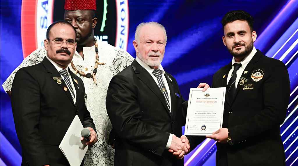 उन्हें यह प्रमाण-पत्र इसी वर्ष मई माह में मुंबई स्थित बाल गन्धर्व रंग मंदिर बांद्रा (west mumbai) सभागार में आयोजित सम्मान समारोह में वर्ल्ड फिटनेस फेडरेशन-WFF इंटरनेशनल के विश्व अध्यक्ष ग्रीम लांस फील्ड द्वारा प्रदान किया गया।